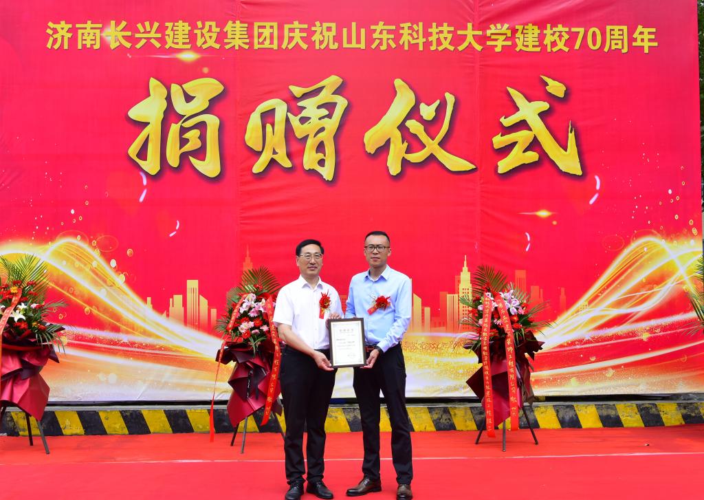仪式上,孙鹤汀与济南校友会代表刘京坤,捐赠校友代表张金生、马兰英、孔建中、孙荣耕、于锡金,合作单位代表济南长兴建设集团副总经理王秀敏、海德恩科技有限公司首席执行官刘康共同开启“共建美丽校园 同庆七十华诞”书轴。校友代表及合作单位代表分别致辞,恭祝学校70华诞,祝贺济南校区校园品质提升工程圆满竣工,衷心表达对母校培养的感恩之情,表示今后将一如既往支持学校发展,助力学校再创辉煌。孙鹤汀代表学校接受捐赠并颁发致谢牌。