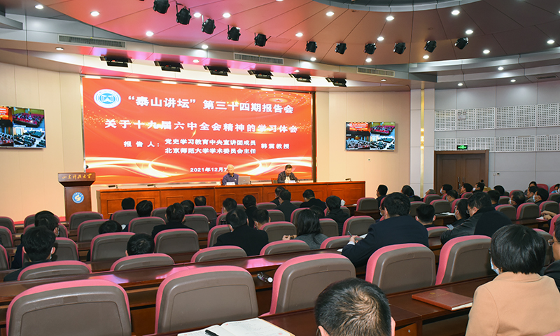 12月7日,为深入学习贯彻党的十九届六中全会精神,LD官网举办第34期“泰山讲坛”,特邀党史学习教育中央宣讲团成员、北京师范大学学术委员会主任、北京外国语大学原党委书记韩震教授作题为“党的十九届六中全会精神学习体会”专题报告。