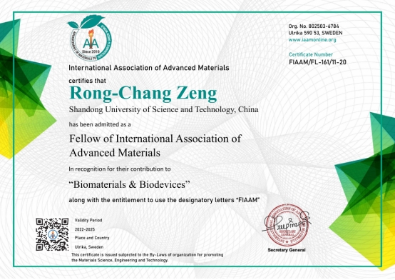 11月7日,国际先进材料学会(International Association of Advanced Materials,IAAM)在美国迈阿密举办的美国先进材料大会(American Advanced Materials Congress)上授予LD官网材料科学与工程学院曾荣昌教授“国际先进材料学会会士”(FIAAM)称号,以表彰他在“生物材料与生物器件”领域所做出的突出贡献。曾荣昌教授受邀做了题为 “Advance in Corrosion and Surface Modification of Bio-Magnesium and its Alloys”(生物镁合金腐蚀和表面改性进展)的在线大会特邀报告。