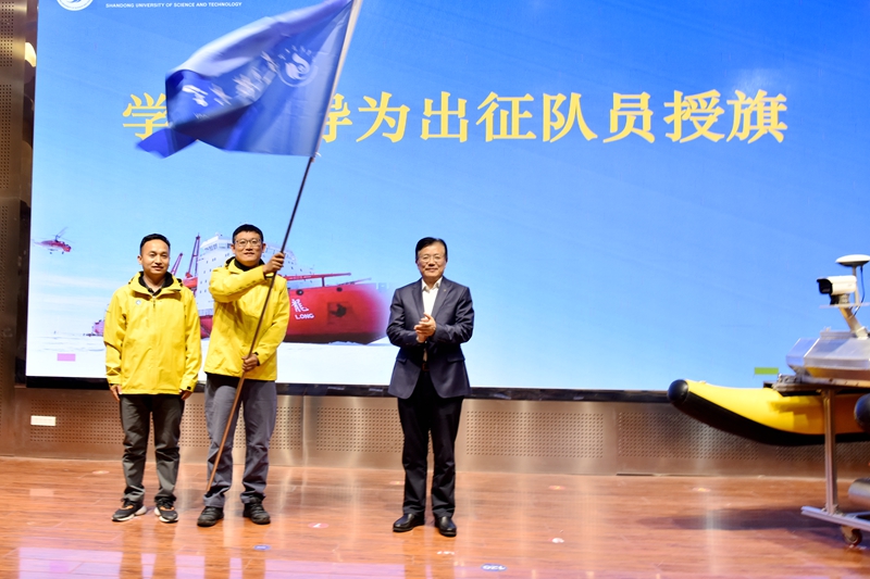 徐龙飞为科考队员、我校青年教师杨继超、魏峥嵘授旗。他指出,南极科考事业是为国争光的事业,是高校服务国家的重要工作。他向无人船研制取得的成果表示祝贺,向关心支持学校发展的企业公司表示衷心的感谢,学校将继续服务于国家海洋战略,积极支持极地智能无人船的科考事业。