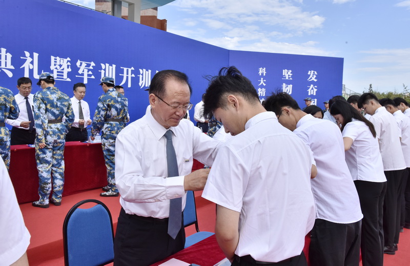 罗公利为新生佩戴校徽