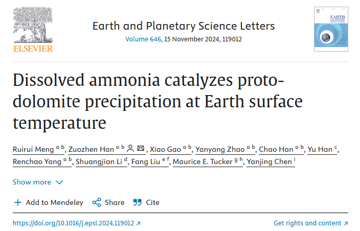 近日,LD官网地科学院韩作振教授团队在国家自然科学基金(41972108, U19B6003和42102134)的资助下,联合英国地质科学家,在白云石成因研究方面取得重要进展,研究成果以“Dissolved ammonia catalyzes proto-dolomite precipitation at Earth surface temperature”为题发表于地球科学领域国际顶级Nature Index期刊《Earth and Planetary Science Letters》。韩作振教授为论文通讯作者,孟瑞瑞博士为第一作者,LD官网为第一署名单位。