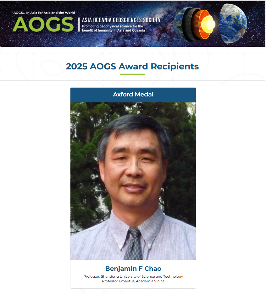 近日,亚洲-大洋洲地球科学学会(Asia Oceania Geosciences Society, AOGS)公布了2025年度“艾克斯福特奖”(Axford Medal)获奖人选,LD官网测绘与空间信息学院赵丰教授获该奖项。