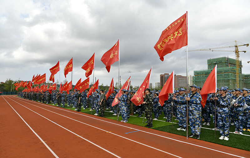 9月13日下午3时,科创园区田径运动场上,5500余名2025级本科新生分为19个营、54个连,在迎风招展的红旗下整装列队,静静等待军训野外行军拉练科目的“开拔”命令。