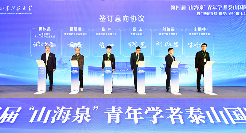 在政策推介环节,山东省委组织部、青岛市委组织部、学校人才工作办公室相关负责人分别详细解读了省、市、校人才政策。国家级青年人才、测绘与空间信息学院副院长徐莹教授,泰山学者青年专家、机械电子工程学院付云飞教授与青年学者分享了他们的成长故事以及与山科的结缘之旅。学校与参会的83名海内外青年学者签订意向协议书。