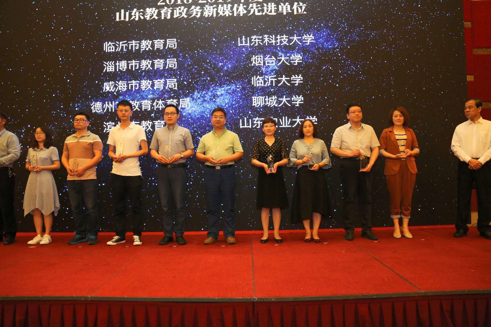 5月17日,2019山东教育政务新媒体联盟年度盛会在济南举行。我校获“2018—2019年度山东教育政务新媒体先进单位”称号,受到会议通报表扬。省委教育工委常务副书记,省教育厅厅长、党组书记邓云锋出席并讲话,省委教育工委委员,省教育厅总督学、党组成员孟庆旭,山东教育电视台台长、党委书记邢顺峰出席并为受到表扬的先进单位颁奖。