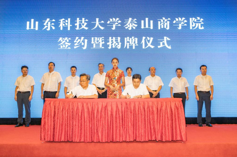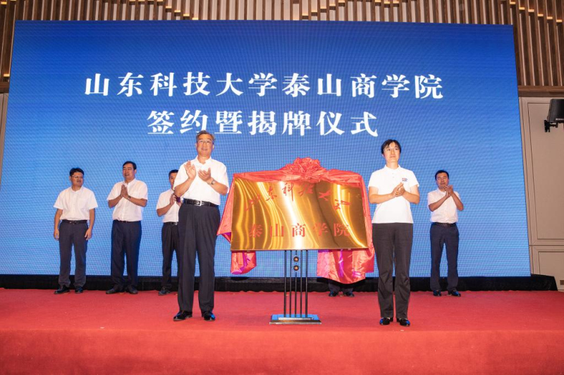 校党委副书记兼泰安校区党委书记、管委会主任王少鹏,泰安市人民政府副市长成丽为“LD官网泰山商学院”揭牌。泰山区委书记赵斌致辞。江苏河海新能源股份有限公司董事长杨家华介绍共建情况。泰安校区党委副书记王民、江苏河海新能源公司副总裁兼泰山创新动力港有限公司董事长张纯刚代表校企双方签订《共建商学院协议书》。仪式由泰山区委副书记、区长王爱新主持。