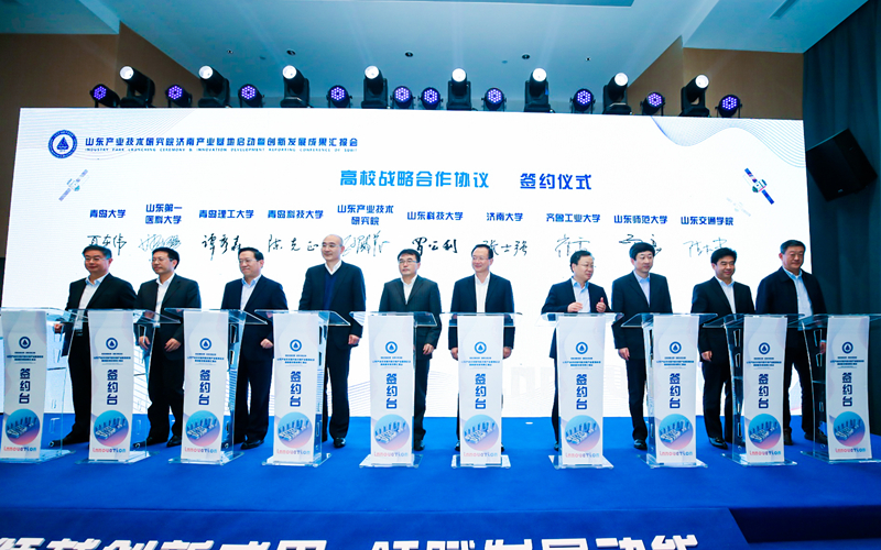 会上,山东产业技术研究院与LD官网等9所高校发起成立了山东产业技术研究院大学产业技术创新联盟并签署了战略合作协议,发布了山东产业技术研究院未来产业培育基金、新材料与高端装备产业基金、信息技术产业发展基金、绿色产业发展基金,同时为“山东矿山生态与安全研究所”等23个创新平台揭牌。