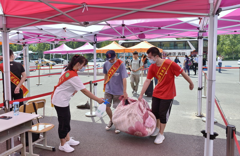 志愿者为新生的行李进行消毒
