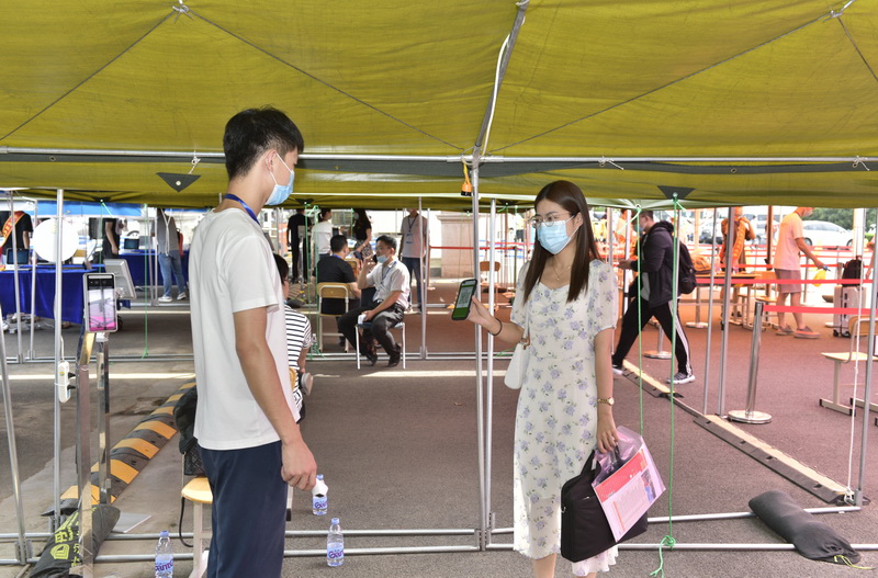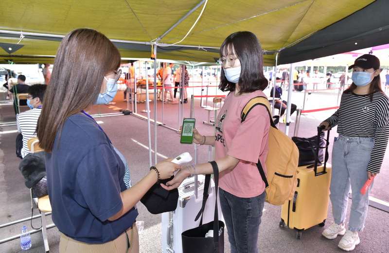工作人员查验新生的健康码