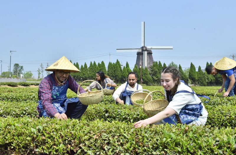 Overseas students from the Shandong University of Science and Technology pick leaves on Saturday at a tea cultivation area in Qingdao, Shandong province. Students from 11 countries, including Russia, Sri Lanka and Pakistan, learned traditional tea-making techniques and tasted the beverage at the event.