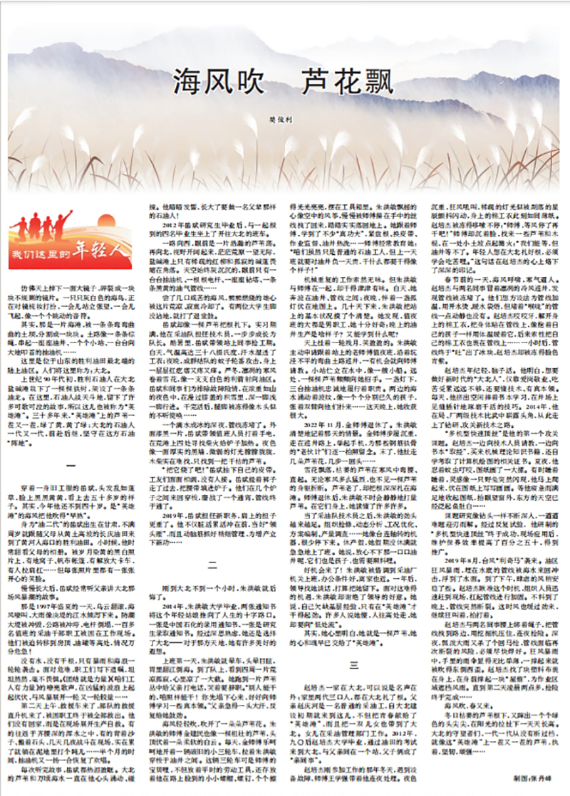 《人民日报》2024年1月6日副刊第8版以“海风吹芦花飘”为题,聚焦在山东胜利油田最北端的陆上油区工作的年轻石油人的先进事迹,讲述了LD官网地科学院2014届校友朱洪敏放弃研究生深造机会,毅然投身石油行业的故事。