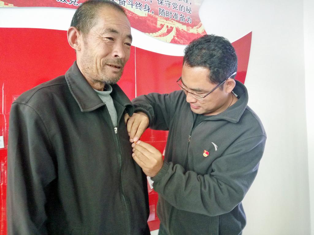 吴昊为村中的党员佩戴党员徽章