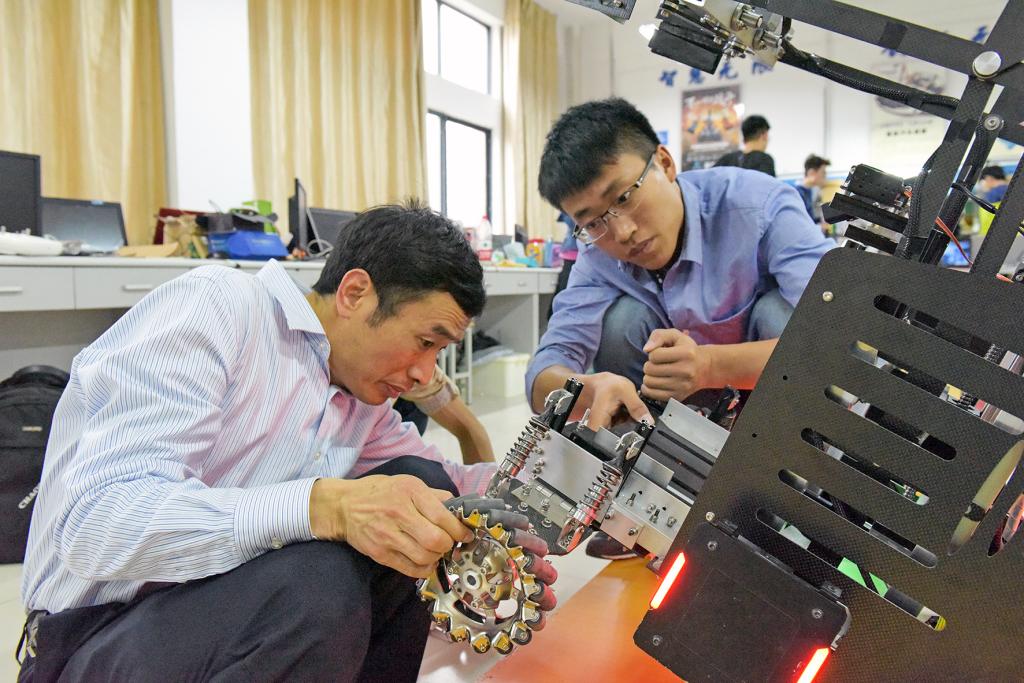 老师指导学生调试参赛机器人