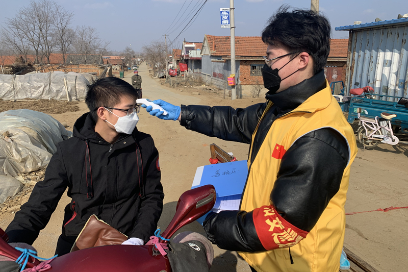 自动化学院电气17-5班团支书王阳,看到家乡莱西市团委发布在校大学生防疫志愿者招募令,第一时间就报上了名,经过疫情防控培训后,他开始负责在莱西市河头店镇姜格庄村口进行抗疫工作。
