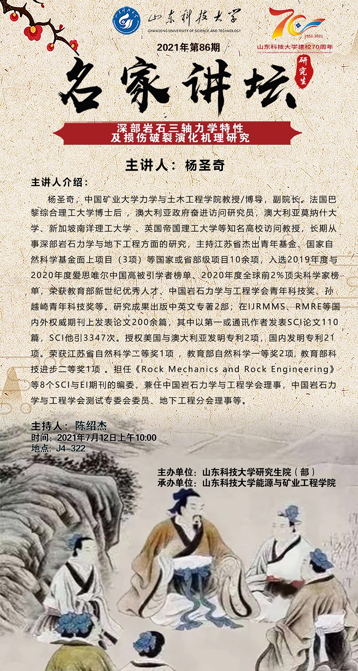 “名家讲坛”2021年第86期:深部岩石三轴力学特性及损伤破裂演化机理研究(总724期)
