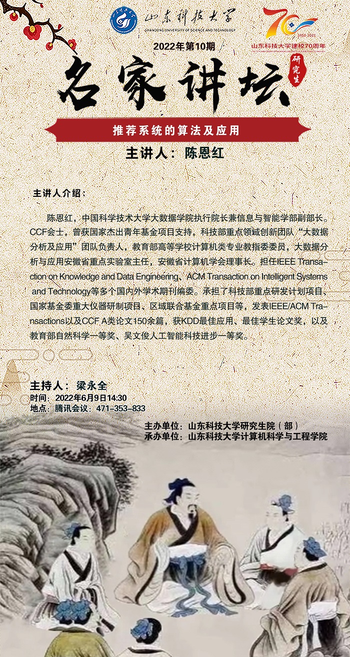 “名家讲坛”2022年第10期:推荐系统的算法及应用(总775期)