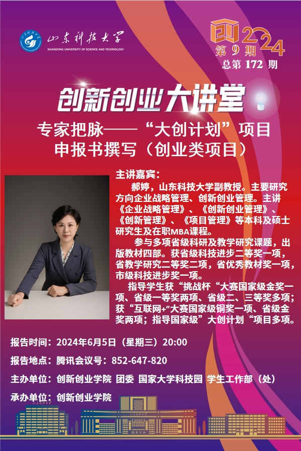 创新创业大讲堂2024年第9期:专家把脉“大创计划”项目申报书撰写(创业类项目)