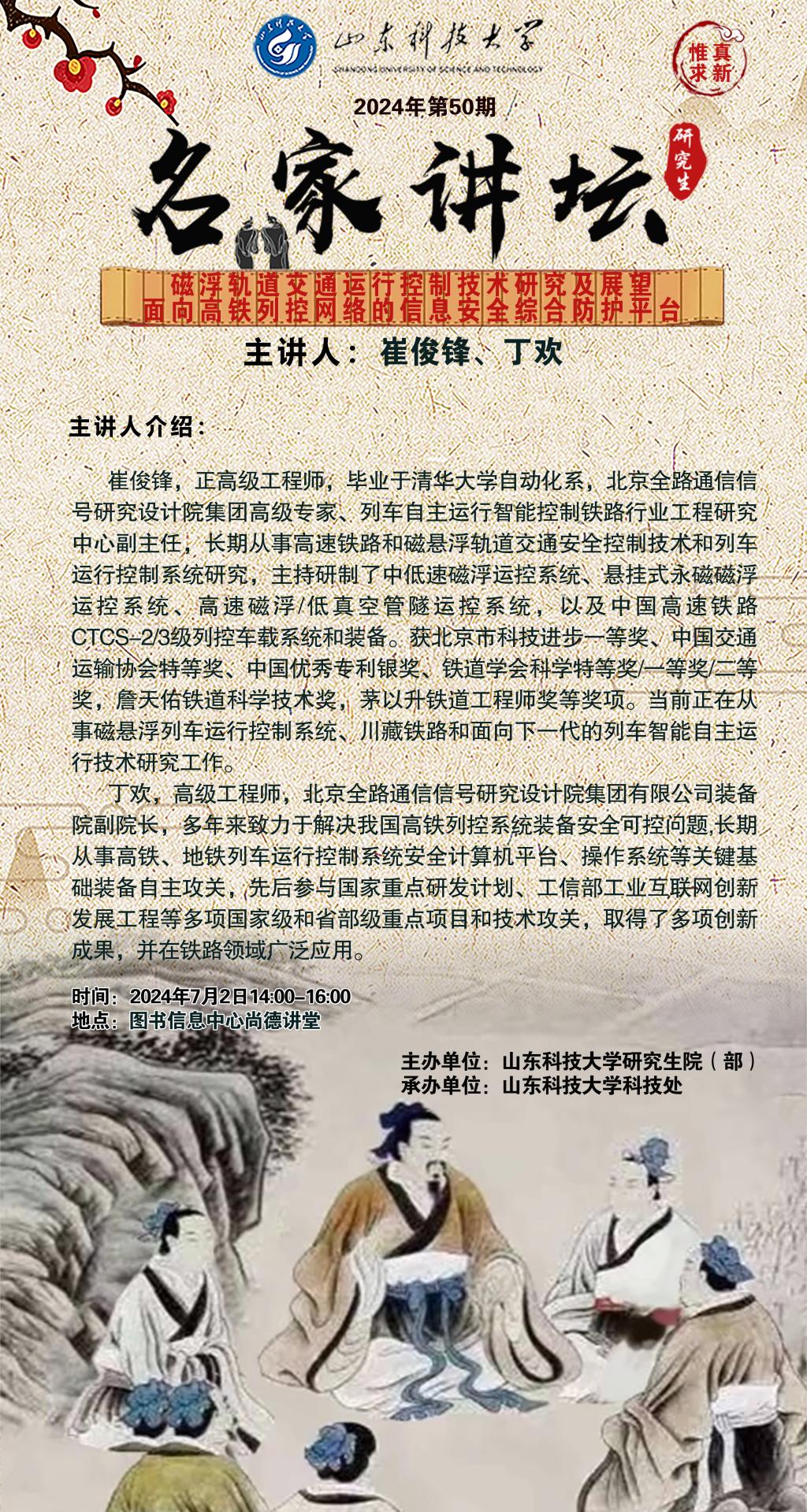 “名家讲坛”2024年第50期:磁浮轨道交通运行控制技术研究及展望、面向高铁列控网络的信息安全综合防护平台(总944期)
