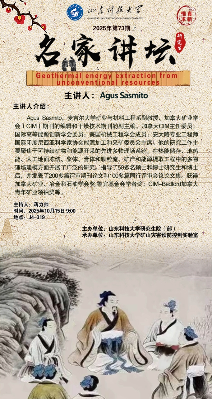 “名家讲坛”2025年第73期:Geothermal energy extraction from unconventional resources(总1078期)