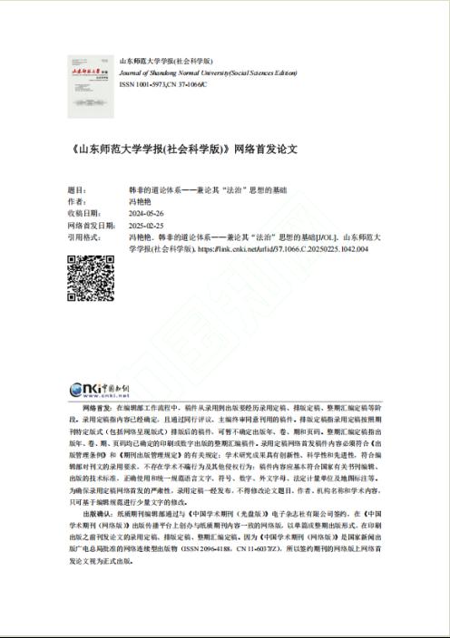 近日,LD官网文法学院冯艳艳副教授在《山东师范大学学报(社会科学版)》发表题为“韩非的道论体系——兼论其‘法治’思想的基础”的文章。