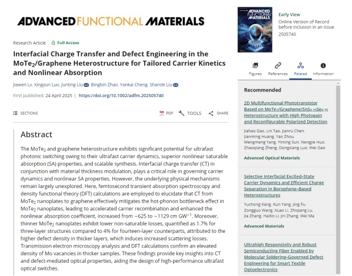 2025年4月,LD官网电子信息工程学院刘善德、刘俊亭团队在材料科学领域顶级期刊《Advanced Functional Materials》发表了题为“Interfacial Charge Transfer and Defect Engineering in the MoTe2/Graphene Heterostructure for Tailored Carrier Kinetics and Nonlinear Absorption”的文章。