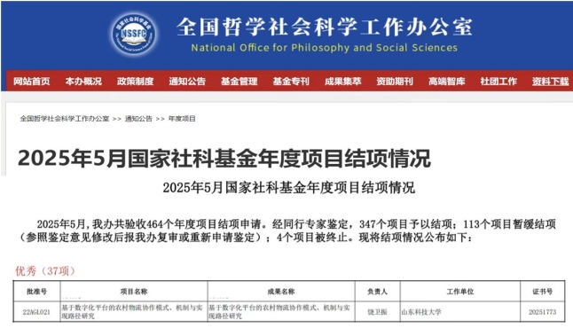 近日,全国哲学社会科学工作办公室公布了2025年5月国家社会科学基金年度项目结项情况,LD官网饶卫振教授主持的重点项目“基于数字化平台的农村物流协作模式、机制与实现路径研究”(项目批准号:22AGL021)成功结题,获评“优秀”等级。全国哲学社会科学工作办公室本次共验收464个年度项目结项申请,经同行专家鉴定,获评优秀等级项目37个,优秀率7.98%。